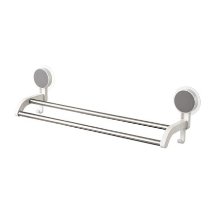 Cetomo Wall Mounted Double-Bar Towel Rack with 2 Hooks for Shower Pouf Cleaning Cloth Brush Scoop Kitchen Bathroom, Plastic Frame Iron Rod No Drill Adhesive, White